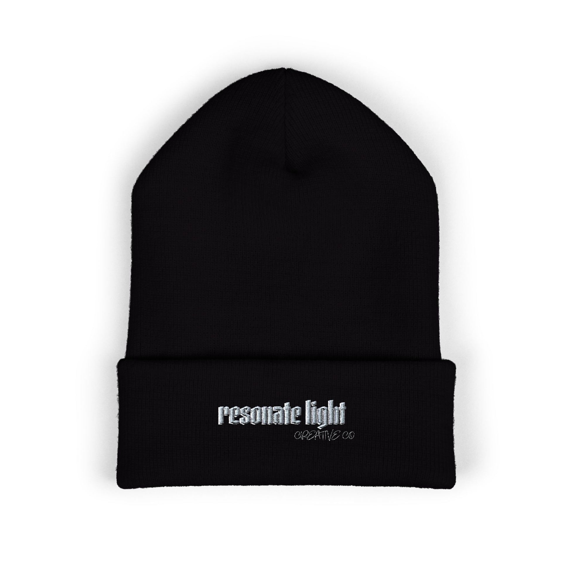 Embroidered "Resonate Light" Classic Cuffed Beanie — Black Knit Winter Hat