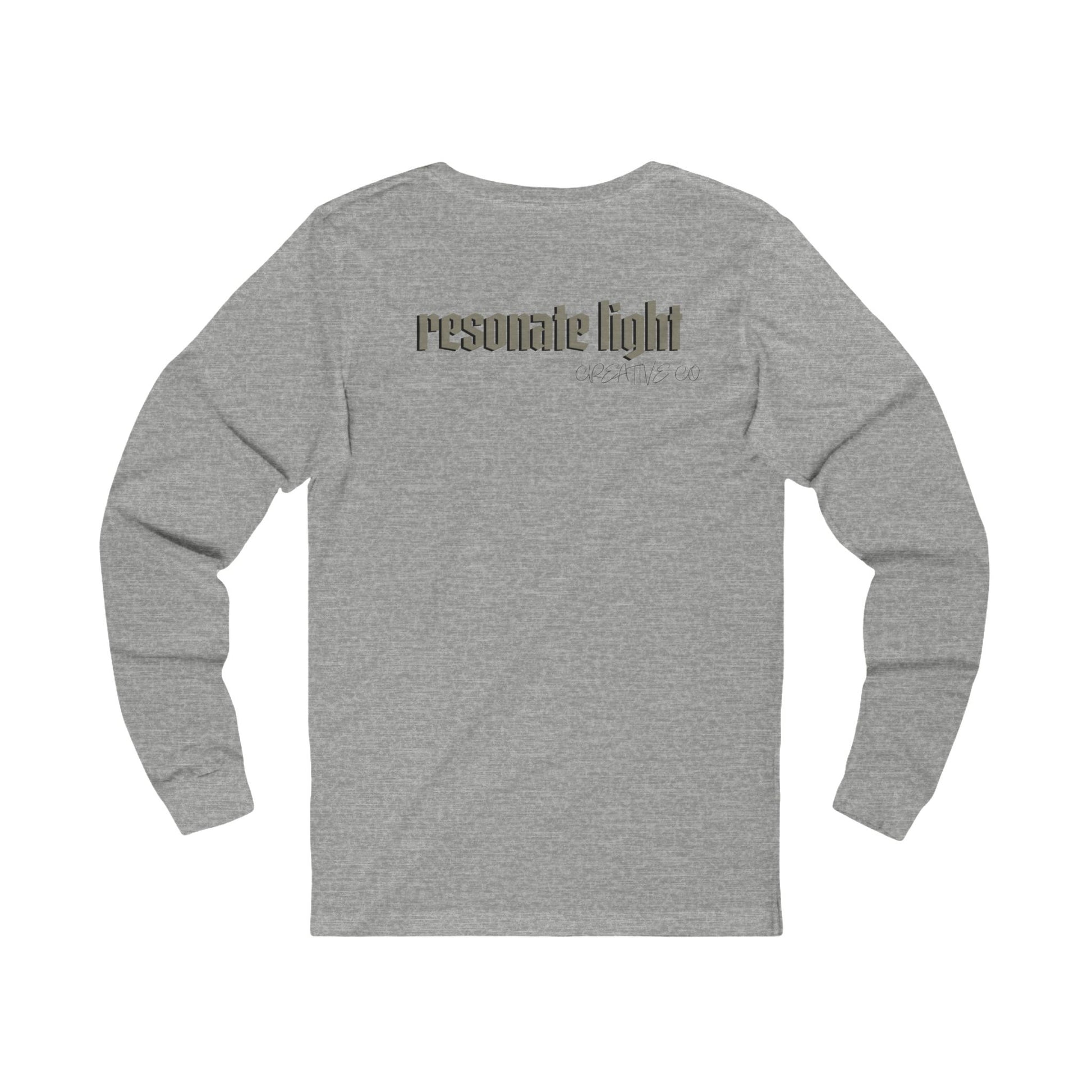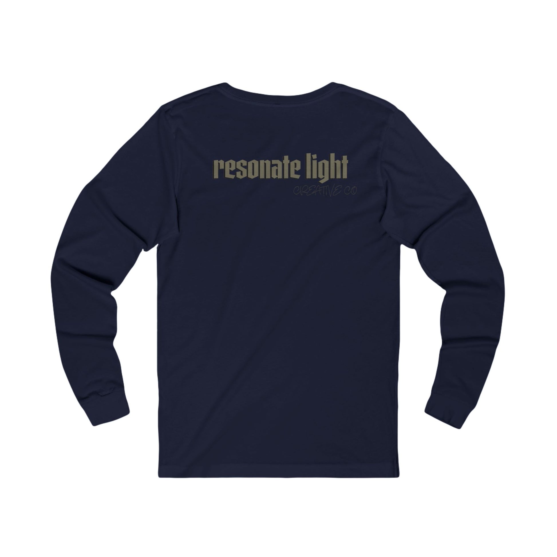 A lightweight long-sleeve tee that feels like a quiet, confident companion. Soft Airlume cotton and a retail fit give it an easy, lived-in drape — the kind you reach for when you want comfort without losing presence. A small, textured emblem on the chest pairs with a subtle, distressed “resonate light” print across the upper back. Together they read like a pledge: calm strength, measured impact. Wear it layered under a jacket for late nights out, or alone for slow mornings with coffee and a playlist. The muted design blends into everyday rhythms while still speaking to those who prefer understated messages and thoughtful visuals.